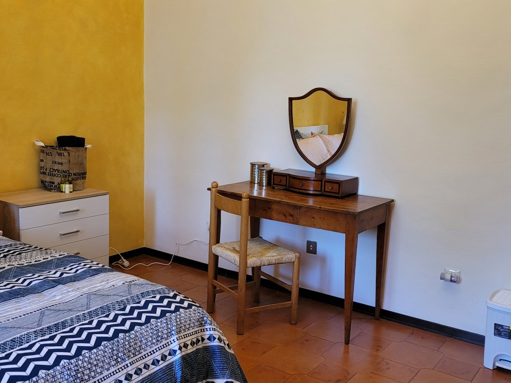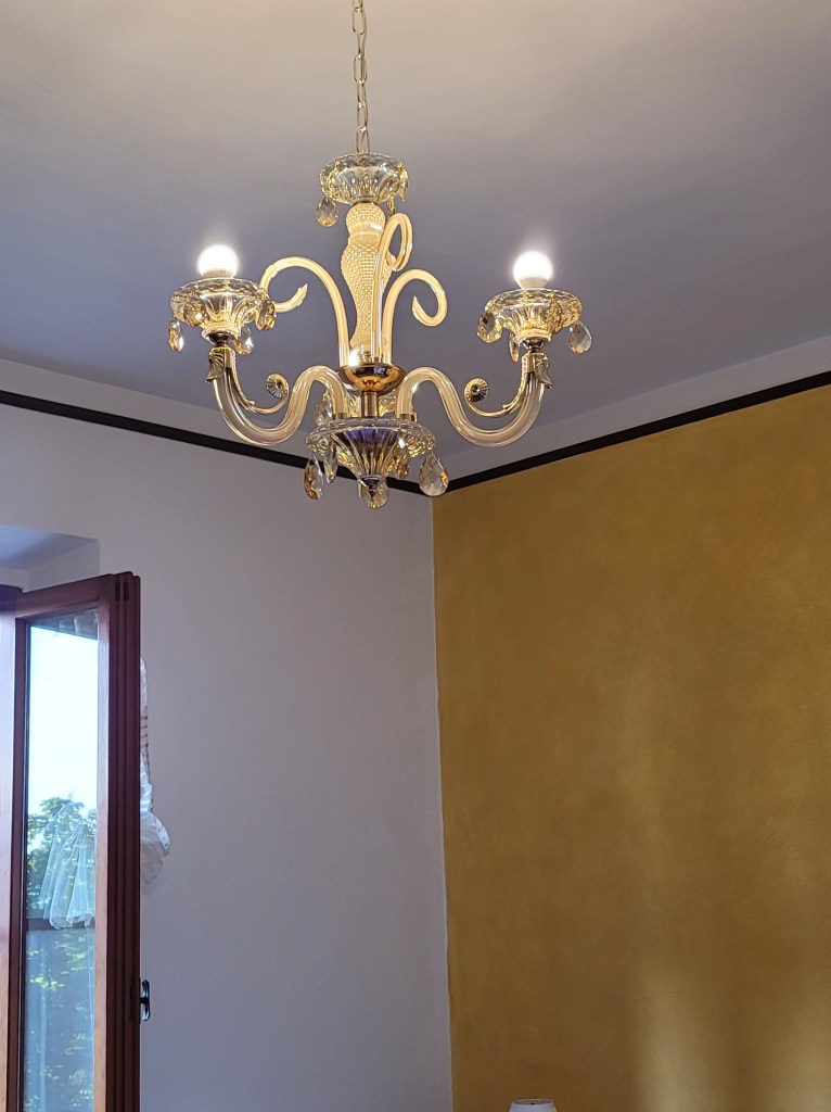 To set it up perfectly for mom, I found an antique dressing table and mirror and had the ceiling light replaced with a beautiful chandelier with golden tones.