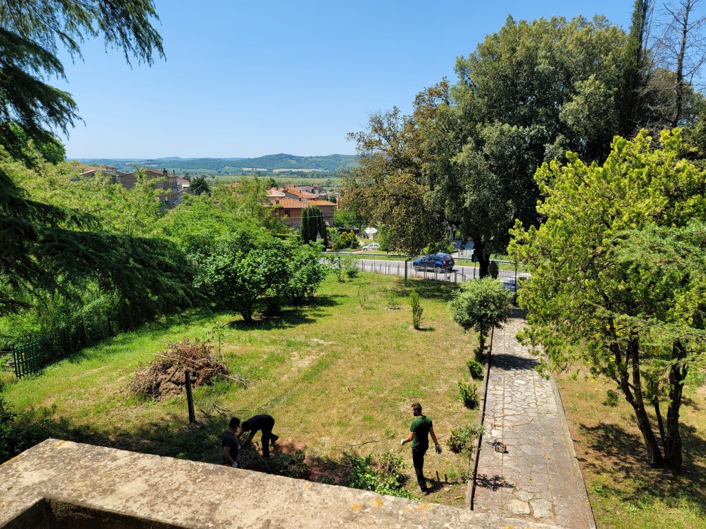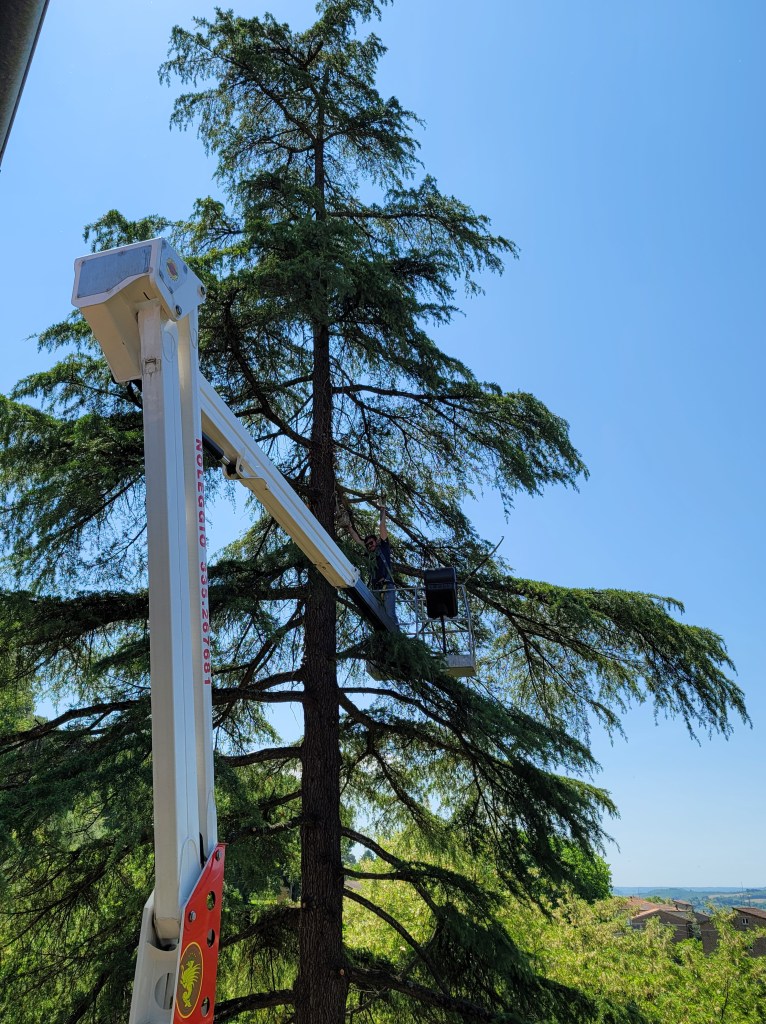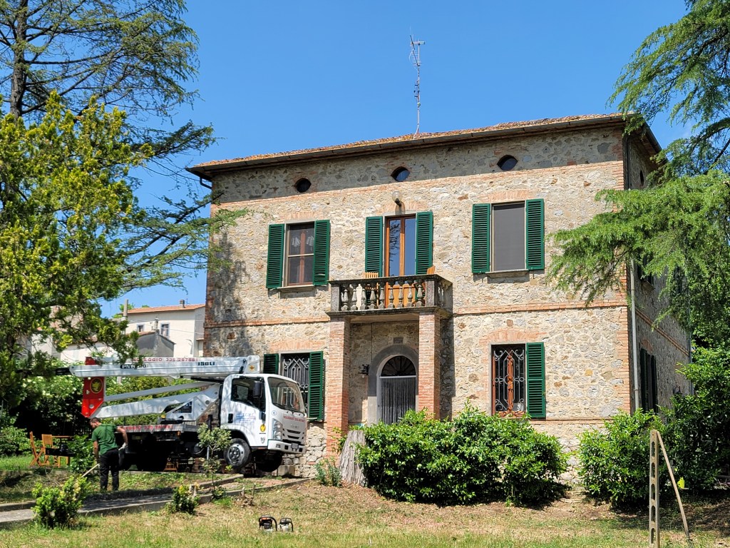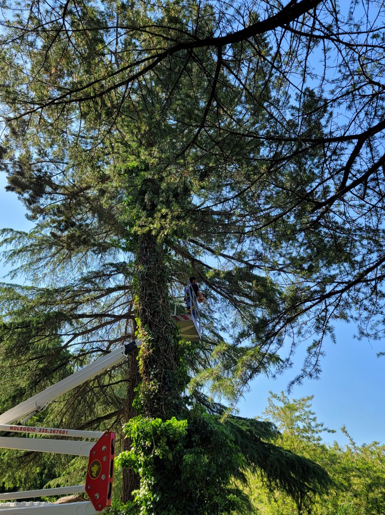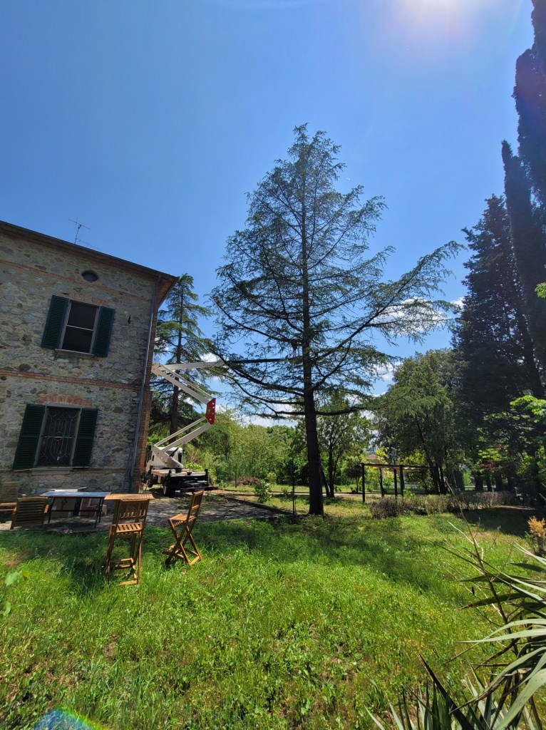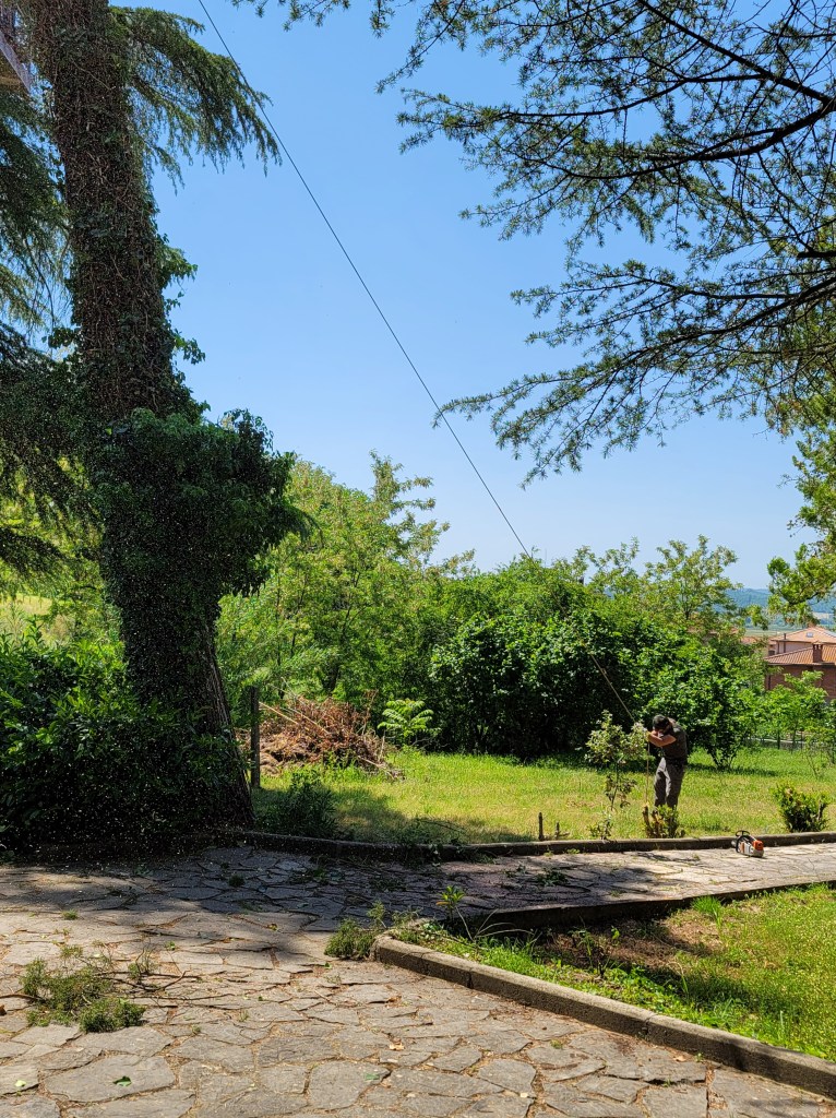 Today was a big day in the garden at Casale Giulietta. We finally have permesso to remove the leaning tree blocking the view from the balcony, as well as thin and clean up the other two trees, one by the pergola and one near the shed. I don’t want to lose them but they haven’t been trimmed or cut in at least a decade, but I suspect more. Time for Adriano and crew to get to work.