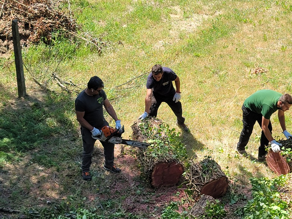 I love watching experts take down a tree. There is clearly a method to the puzzle in getting it just right and keeping everyone safe. When it got down to what looked like a giant poker, Adriano hooked a rope around it from the lower yard and began to pull. There is a reason I refer to him as Thor!