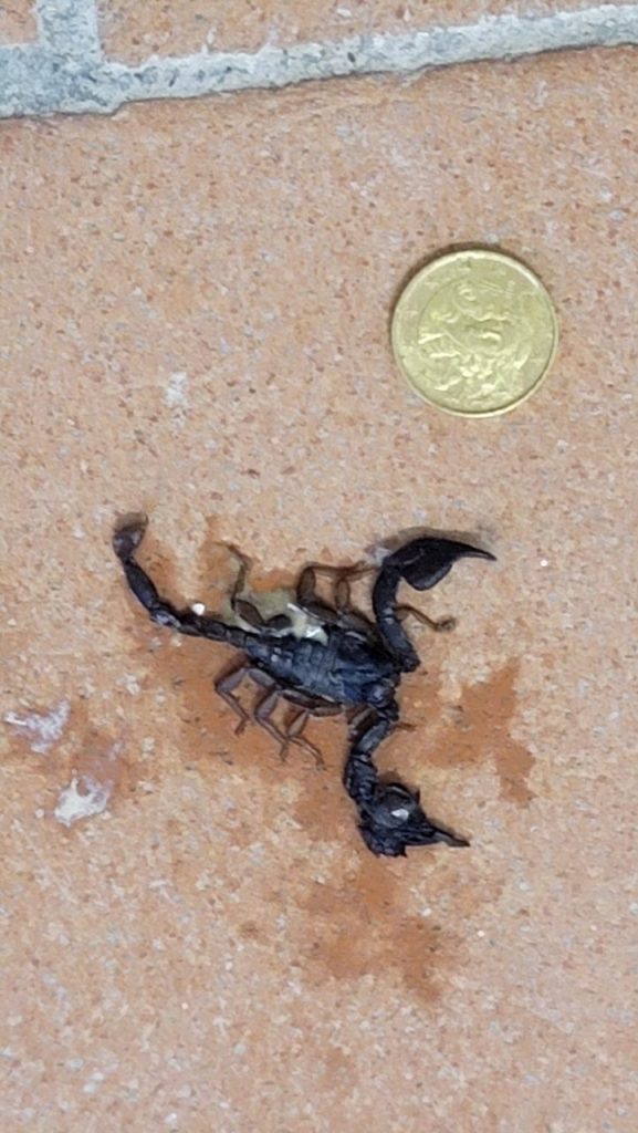 At this point, it’s close to 10:30pm, I still have some packing to do, but this takes precedence. I sprayed the scorpion with some lavender oil and then some bug spray. I then swooshed it down and outside with a small hand broom. Once outside, I swept it away from the door, hoping it would find its way somewhere away from the door. 4am wake-up time is going to feel really awful tomorrow!!!