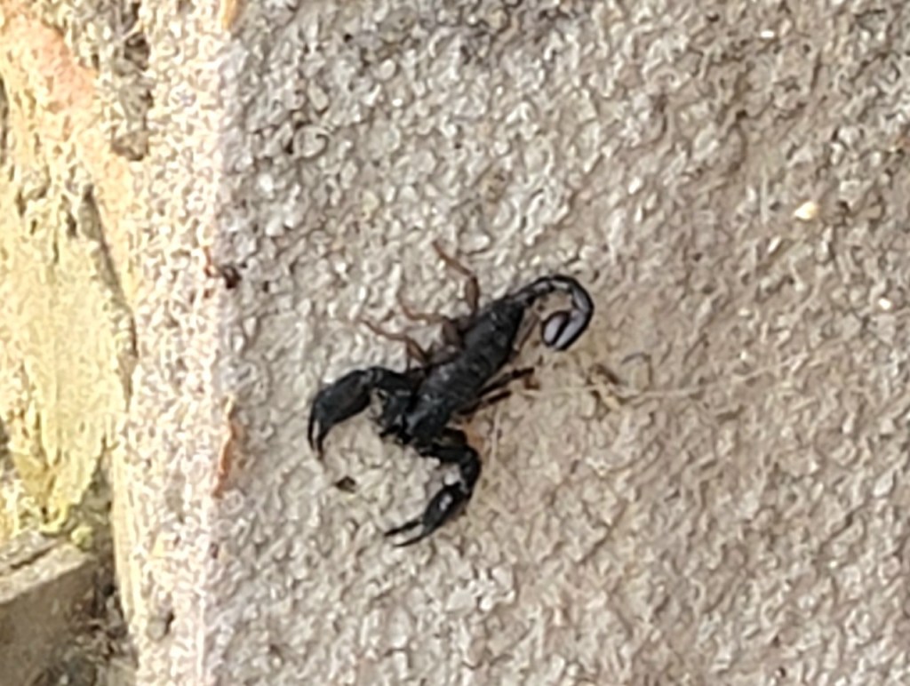 I found my first scorpion in the spring of 2022 in the shed, which I guess shouldn’t be a surprise. I quickly learned to open the shed doors, walk away and give them time to get back into the dark and hiding. They aren’t big, but if you have ever seen a scorpioin, you will know that they are creepy looking. I prefer not to see them if I can help it. They also change size and shape once they are angry.
