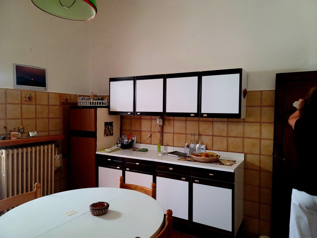 When we viewed the house in June 2021, the kitchen was in the southeast corner of the house, where the traditional Umbrian fireplace lived. It’s beautiful and a showpiece. I asked the Geometra if we could make this room the dining room and open the shared wall between the kitchen and the living room. We would then make the current pantry / dining room the new kitchen (in the northeast corner of the house).