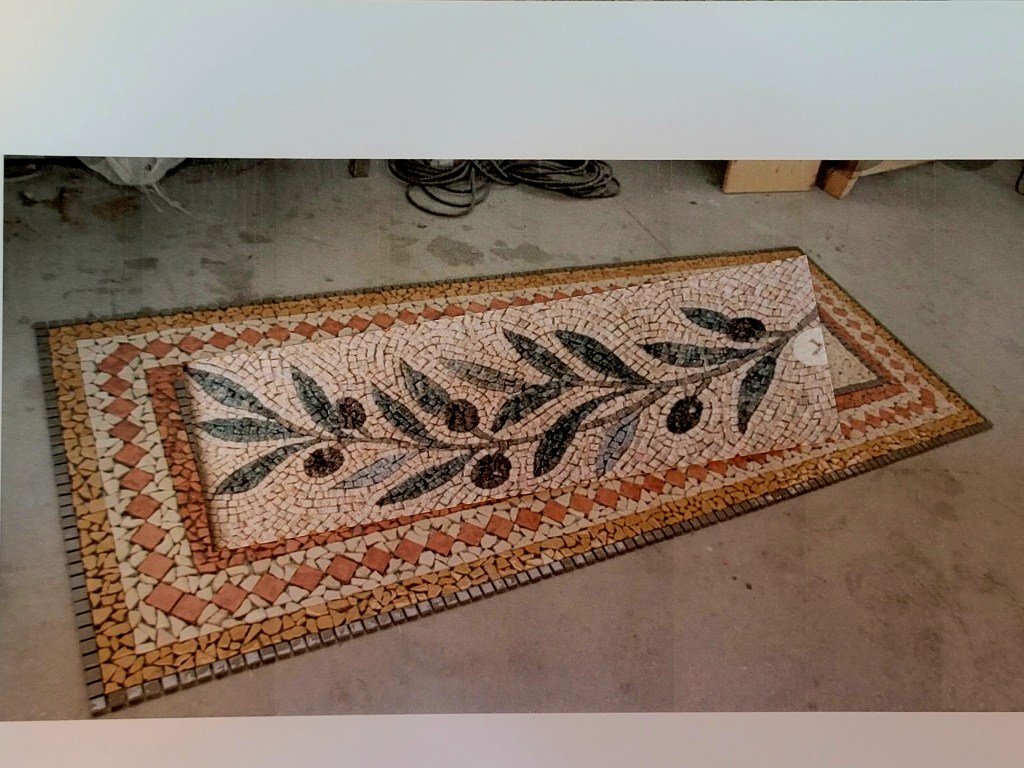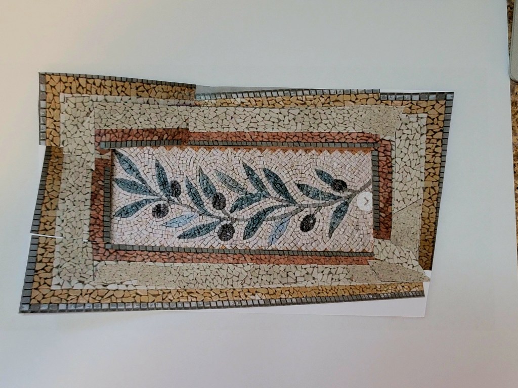 Marco shared a picture of a mosaic design and then I started searching on Pinterest for ideas. I really wanted to capture the colors of the room but also the spirit of the Umbrian region. What spoke to me was olives and vines. I printed off a bunch of pictures, cut them up and made a piecemeal design from which to draw inspiration.