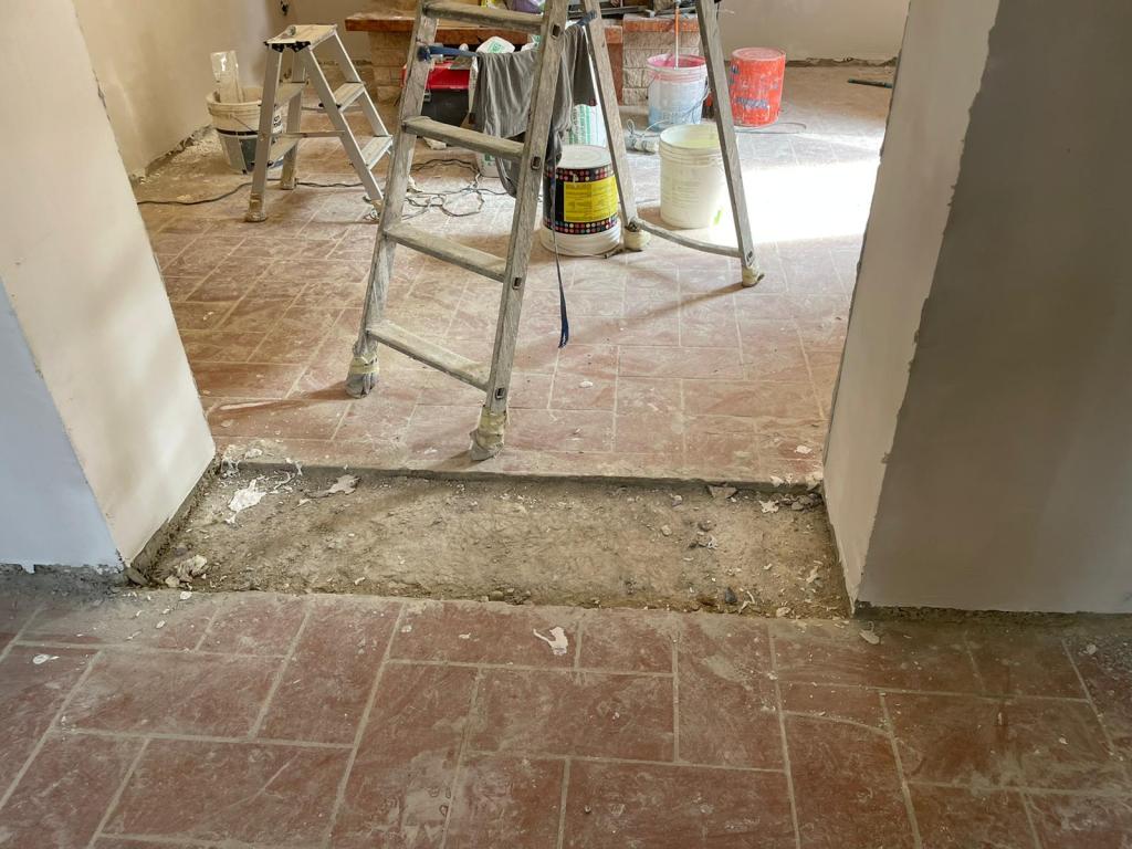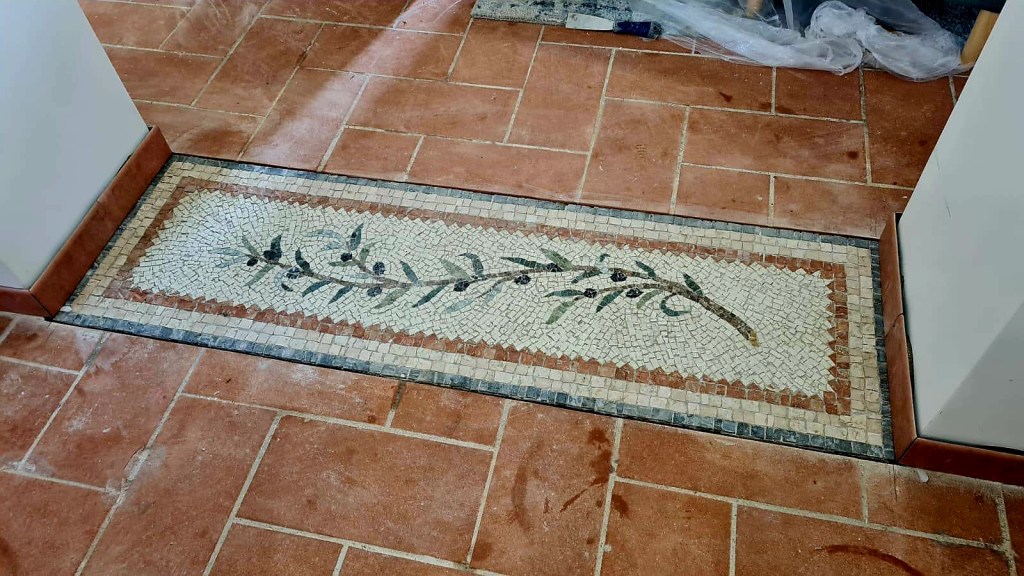 Now the dilemma was how to fill the gap in the old terracotta floor where the wall once was. We would never be able to match the terracotta given their age, so Marco suggested that we create a mosaic design incorporating the colors in the marble, stone and floor in the new dining room. Brilliant!