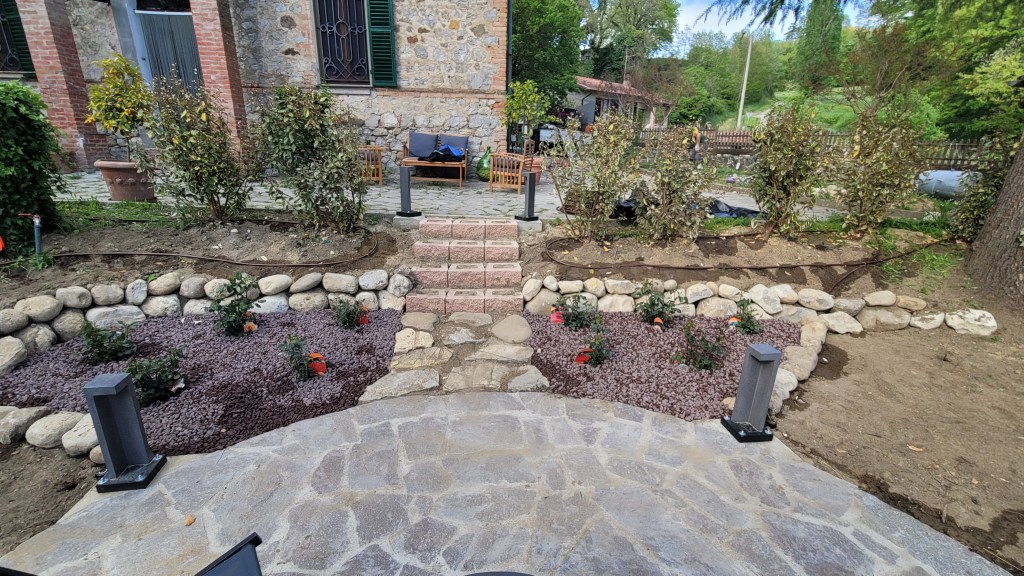 In April our focus was on getting the new plants in the ground and the lighting installed. Adriano’s crew showed up with a truckload of plants and spent the day getting everything planted and ready to grow. Border hedges, strawberries for the retaining wall, aloe vera for the top of the retaining wall, 3 olive trees, 2 fig trees, an apricot and a plum tree, as well as lavender plants to border off each of the terraces. Adriano also surprised me with a rose garden by the firepit terrace and two orange trees, one on each side of the front door.