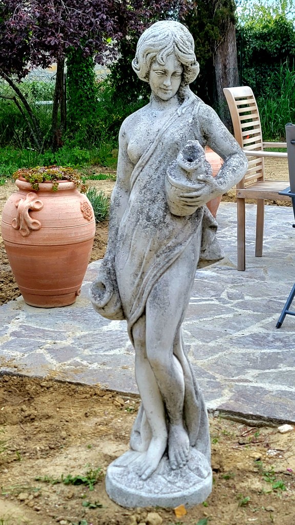 When I arrived back in Italy in late August, he had surprised me by creating a pond surrounded by an ivy-like plant and making her the glorious fountain that she is today.
