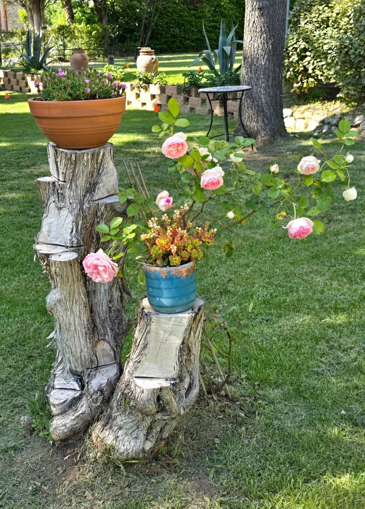 The tree on the right of the path died so we cut it down. Again, as a surprise, Daniel, Adriano’s brother was an artist with his chainsaw and left me wtih a beautiful tiered stump and planted a vining rose next to the stump.