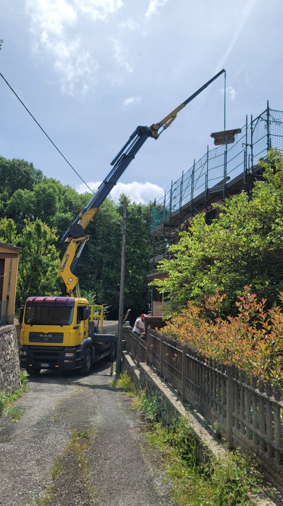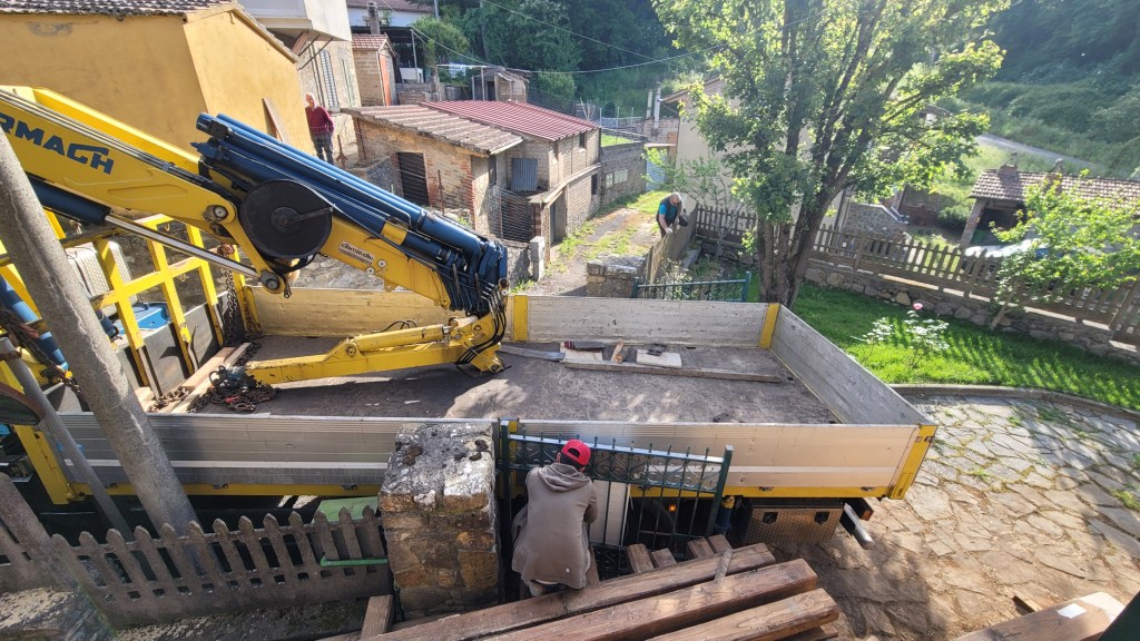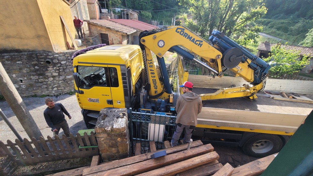 In the spring, I had signed up for 3 hours of language lessons per day for two weeks in Orvieto to hopefully advance my Italian skills at a faster pace. However, one morning as I was getting ready, there was a very loud commotion outside at the back gate. There was a giant truck with a crane backing up my drive, trying to squeeze through my gate. SERIOUSLY! There was no way that thing was fitting through the gate, but with a lot of maneuvering and shifting, they made it work. WHAT?! I was very impressed. I was definitely going to be late for muy lesson but I had to stay and see what was going to happen.