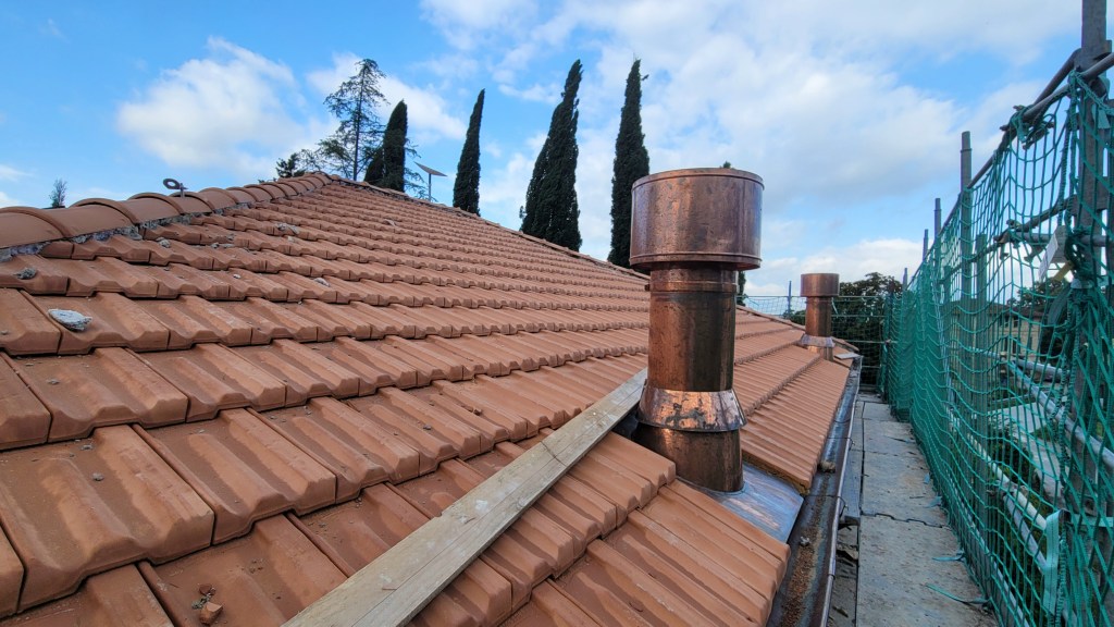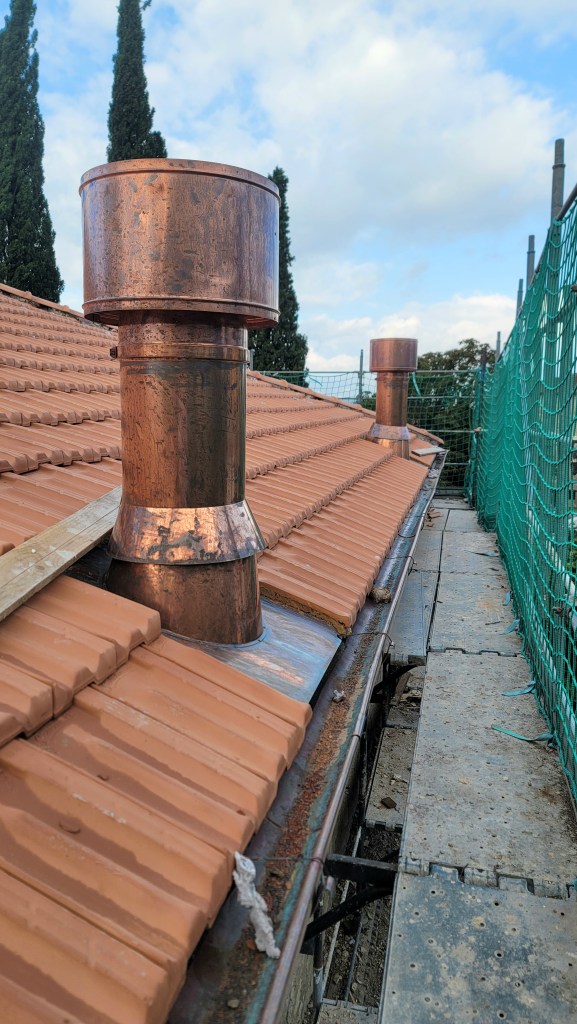 One morning, after mowing the lawn, I had an itch to climb the scaffolding and take a look at the new roof for myself. Marco, being a contractor and Geometra, devised a brilliant solution to rebuilding the chimney stacks. We didn’t want them to take up space in the new rooms, but we also knew it would look strange to build them on the outside of the house. What he came up with was a plan to place large copper tubes to direct the chimney flow from the inside to outside. They are not only functional but exceptionally beautiful. I love this solution!!!