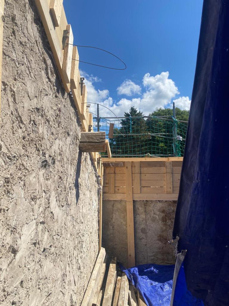 Time to start elevating and rebuilding the roof. The wood panels are structural forms to poor the concrete to raise the height of the walls to bring it up to code.