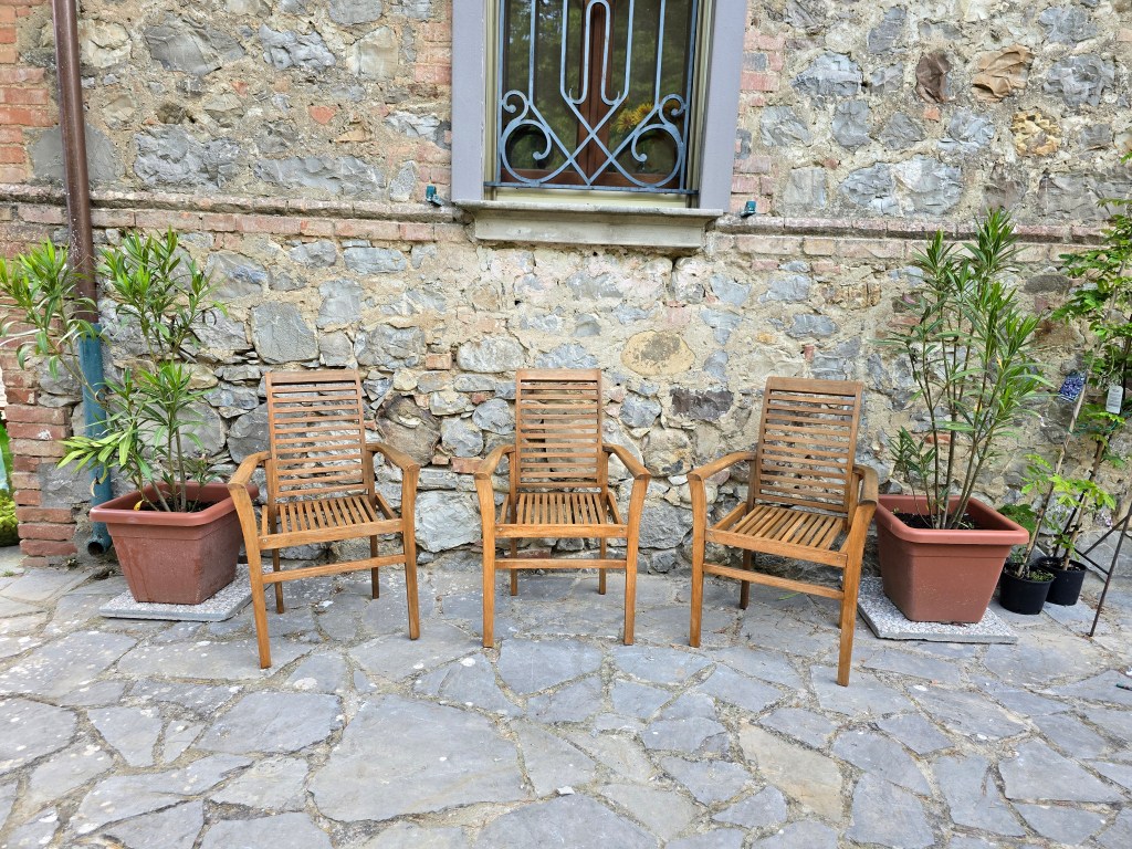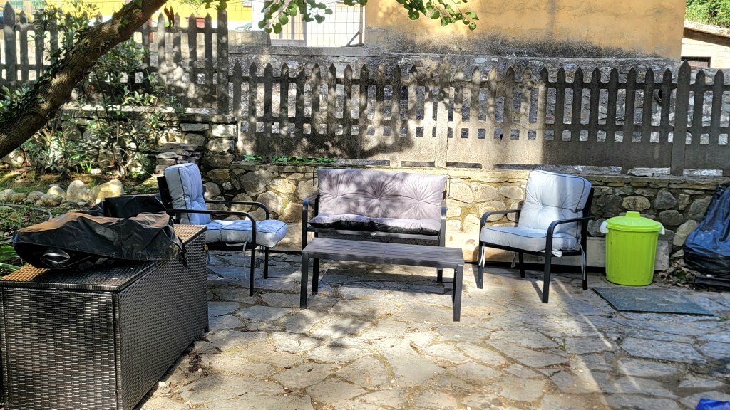 The 3 chairs that almost killed me to build finally found a new home. I put them on the south side of the house facing the shed and the small garden. They are a nice place for breakfast in the morning, as they get just the right amount of sun. They have also provided the workmen a nice place to rest and have lunch. Yay!