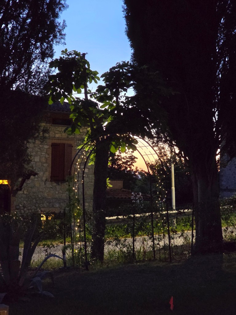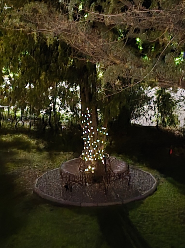 Finally, I wrapped the tree with the bench with twinkle lights that are solar powered. I also wrapped the new garden arch where I planted the wisteria. It’s fun at night!